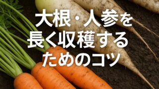 家庭菜園 【保存版】大根・人参を長く収穫するためのコツ|家庭菜園での管理と失敗回避法 大根や人参は家庭菜園でも人気の根菜類。収穫の楽しみが大きい一方で、「一度に収穫が終わってしまう」「すぐにス入りして食味が落ちる」と悩む方も多いです。この記事では、大根・人参を長く収穫するための栽培管理の工夫と収穫方法を詳しく解説します。栽培... 2025.09.03 家庭菜園
